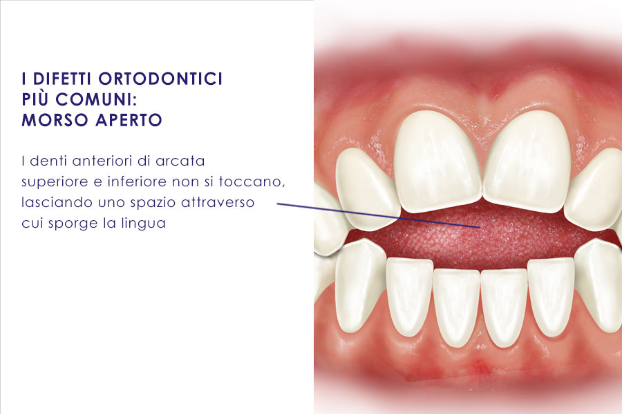 - Morso aperto: osservando la bocca da chiusa si osserverà anteriormente, fra i denti superiori e ed inferiori, una sorta di buco in cui il bambino facilmente interporrà la lingua.